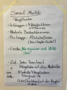 Als aufmerksame Leserin des METALOG Produktmagazins bin ich auf SmartMarble gestoßen. Ich kannte das Tool davor nicht, habe aber auch keine Scheu, mit etwas Neuem zu arbeiten. Ich habe mich mit Bastian Karrasch zum Setup beraten und angesichts von 40 Workshop-Teilnehmenden wurde deutlich, dass es sinnvoll ist, mit zwei Sets – also insgesamt vier Kugelbahnen – zu arbeiten. Mit FindMe habe ich dann zum Start noch das Team ganz wild durcheinandergemischt und so Menschen in den Gruppen zusammengestellt, die sonst nichts miteinander zu tun haben. Ich wollte, das auch andere Menschen in Verantwortung gehen als diejenige, die sonst die Sub-Teams im Alltag leiten.